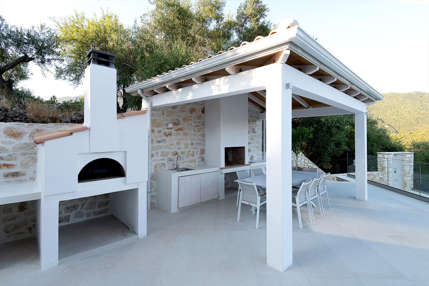 Upper Outdoors Area Parking spaces for two cars, fully equipped BBQ area including an electric stove, sink and traditional wood oven, seating area with dining table.